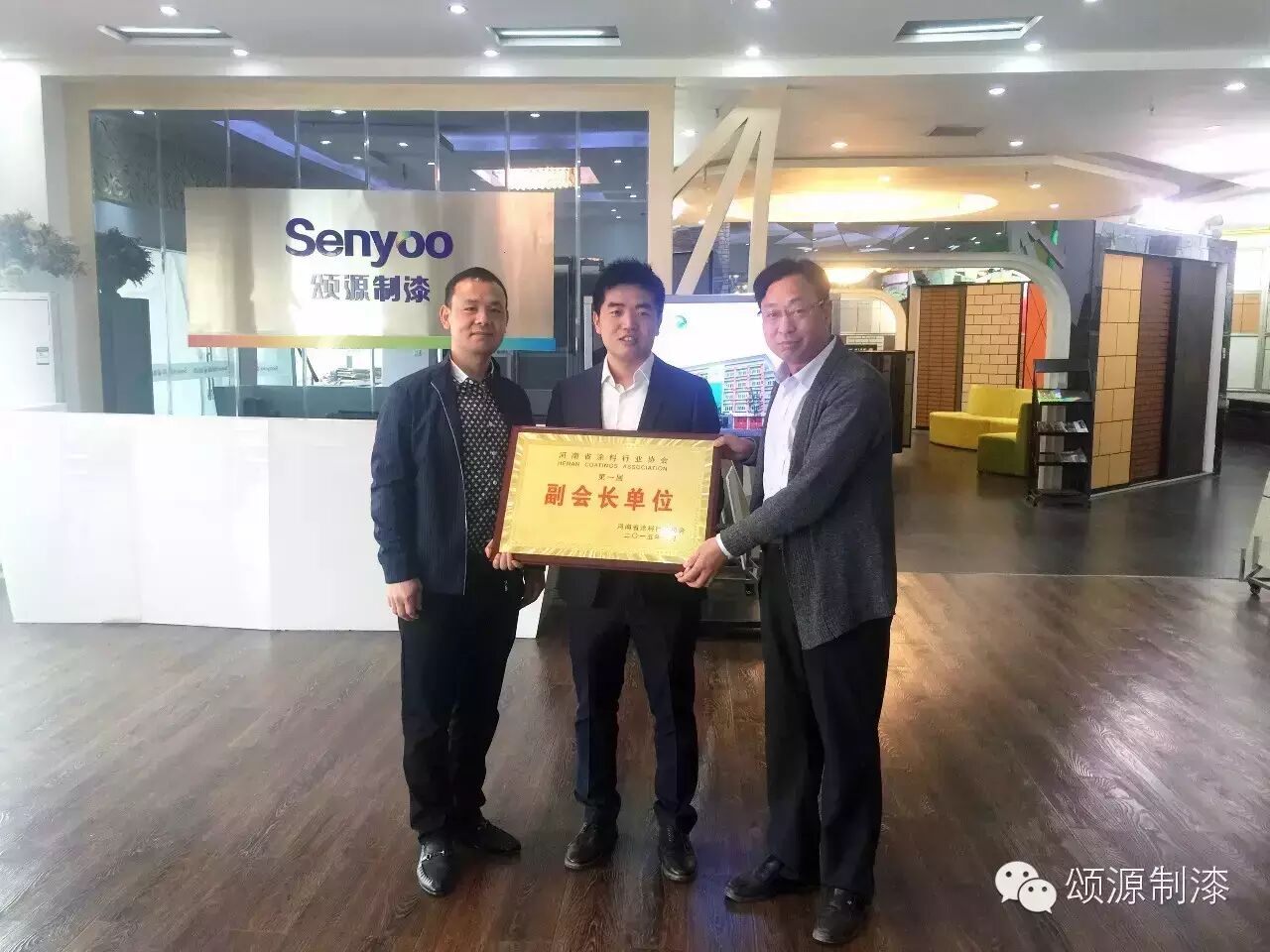 2016年4月9日,河南涂料行業(yè)協(xié)會秘書長蘇全軍一行蒞臨頌源制漆涂裝科技展廳,親自為我公司授匾——“河南涂料協(xié)會副會長單位”。自此,頌源涂料成為河南涂協(xié)成立以來,第一個以水性建筑涂料生產(chǎn)研發(fā)為主的副會長級單位。